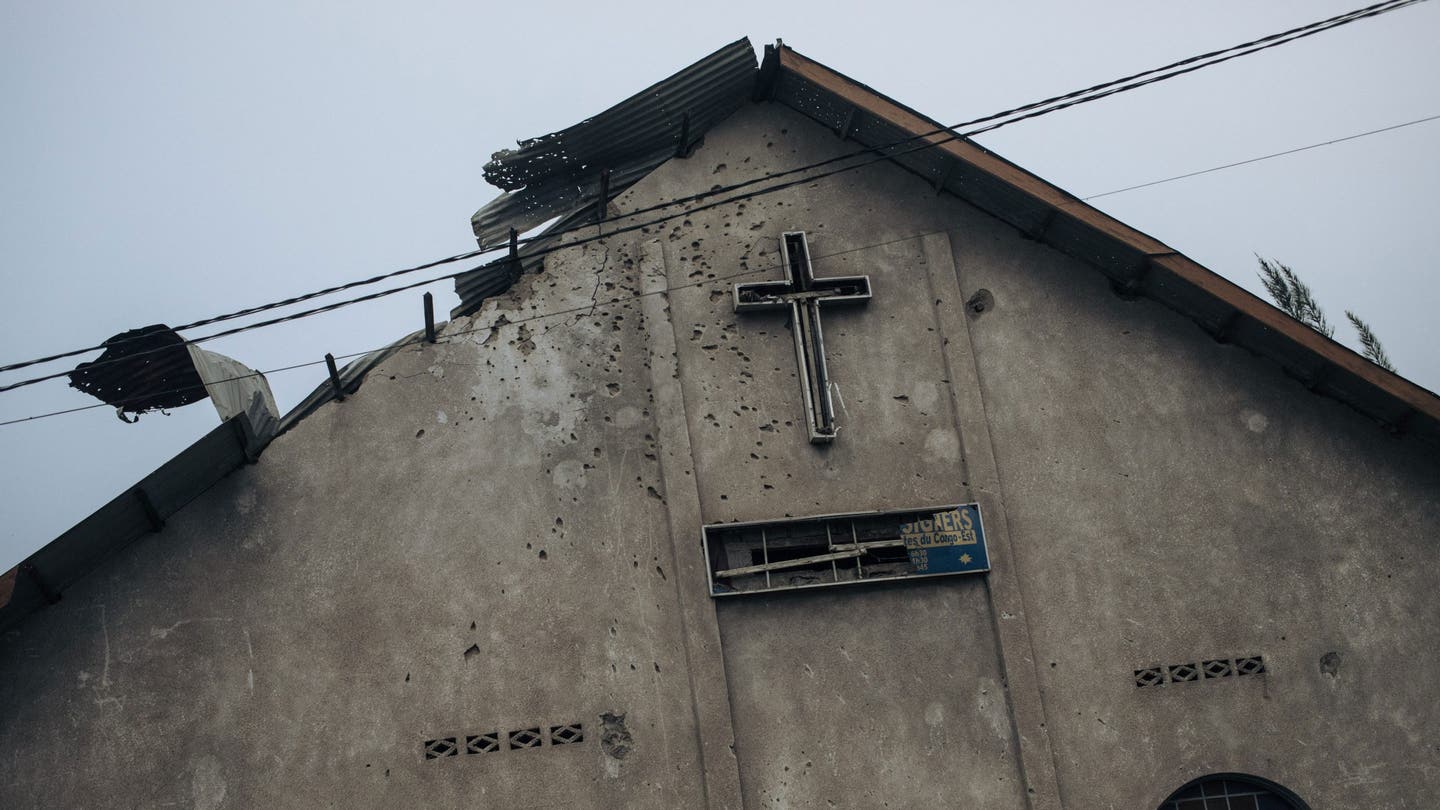 2025 년 1 월 30 일 고마에서 충돌 한 후 포병 껍질에 맞은 교회의 외관. (게티 이미지를 통한 Alexis Huguet/AFP)